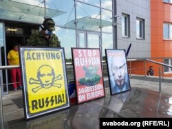Мастак атабарыщся на прыступках «Эўраопту» з плякатамі «Achtung Russia!» і «Bloodymir!» з выявамі Пуціна, а таксама «Stop russian agression on Europe» («Спыніце расейскую агрэсію ў Эўропе»), «Russia — war!» («Расея — вайна»), «Беларусь у NATO» і сьцягам Паўночнаатлянтычнага альянсу.